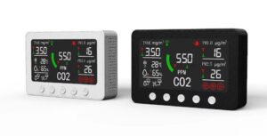 De AEWPT serie is een uitgebreide doch eenvoudige CO2 binnenklimaat meter voor metingen in scholen, huizen, kantoren en vele andere gebouwen en ruimtes. Dit mooie en duidelijke kleurendisplay laat naast het CO2 niveau ook de relatieve vochtigheid, temperatuur en fijnstofniveaus zien. Deze meetwaarden bepalen of een ruimte “gezond” is of niet en of er geventileerd moet worden of niet. Uiteraard heel belangrijk voor ruimtes waar heel veel mensen verblijven zoals kantoren, clubgebouwen, kerken, vergaderruimtes, scholen, enz. Immers, indien er niet voldoende of op tijd geventileerd wordt kan dit resulteren in een verslechterd binnenklimaat met als eventueel gevolg sufheid, hoofdpijn of misselijkheid. De AEWPT is voorzien van zowel akoestische als visuele alarm/schakelpunten, welke ingesteld kunnen worden. Men wordt dus gealarmeerd zodra de CO2 waarde te hoog is. Dit geldt tevens voor de fijnstofwaarden. Ook is het mogelijk om de ventilatie te schakelen met de relaiscontacten op de achterzijde van het display (zowel de CO2, fijnstof als relatieve vochtigheidswaarden).